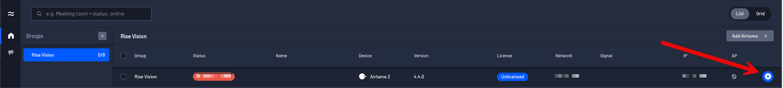 - On the right-hand side, select the desired Airtame device's settings menu (Gear icon)