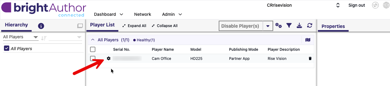 If the Rise Vision Application setup does not automatically start, navigate to the Network tab, and open the player’s Open Remote DWS (Gear icon).