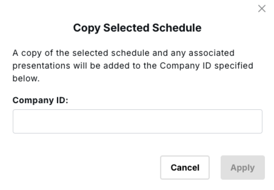 - Then click Apply. The Schedule and all its Presentations will be copied to the Company you specified.